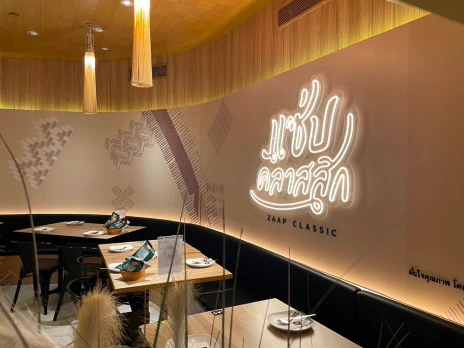 “ Zaap Classic serves the ordinary northeastern Thai cuisine such as grilled chicken, papaya salad (Som Tam), spicy minced meat salad (Laab), spicy salad (Yum), sliced grilled meat salad together with the company’s popular products such as sour pork, white pork sausage, northeastern Thai sausage Etc. More importantly, each dishes must go through the extensive selecting process and meticulous cooking steps from the product development team who possess more than 30 years of experience. This is why Zaap Classic becomes ordinarily special and gains trust from all customers in terms of cleanliness, quality and service.”