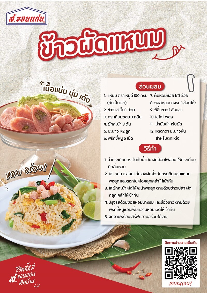 - ใส่แหนม ส.ขอนแก่น ลงผัดคั่วกับกระเทียมจนแหนมพอสุก และตอกไข่ ผัดคลุกเคล้าให้เข้ากัน